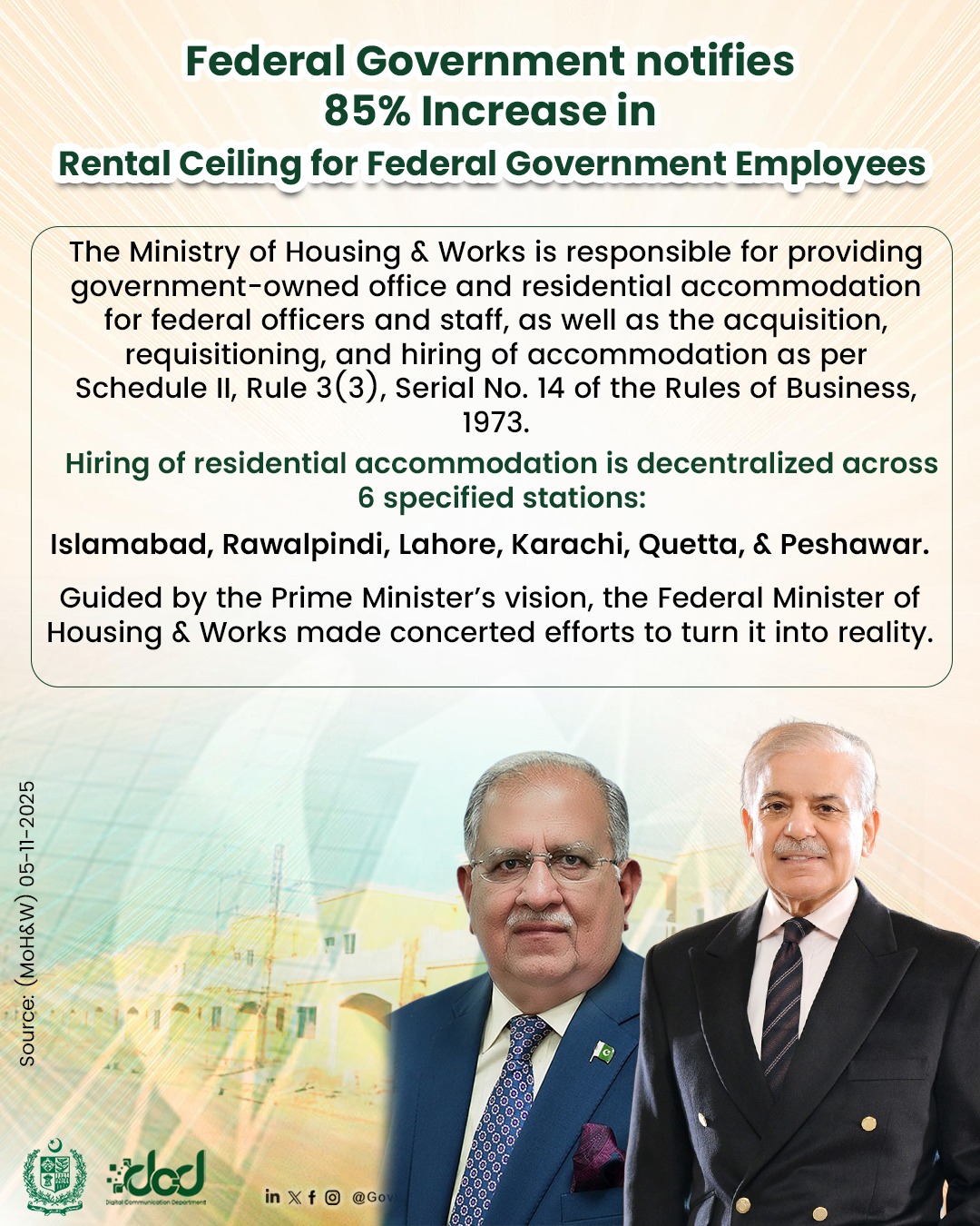 Federal Government notifies 85% increase in Rental Ceiling for Federal Government Employees