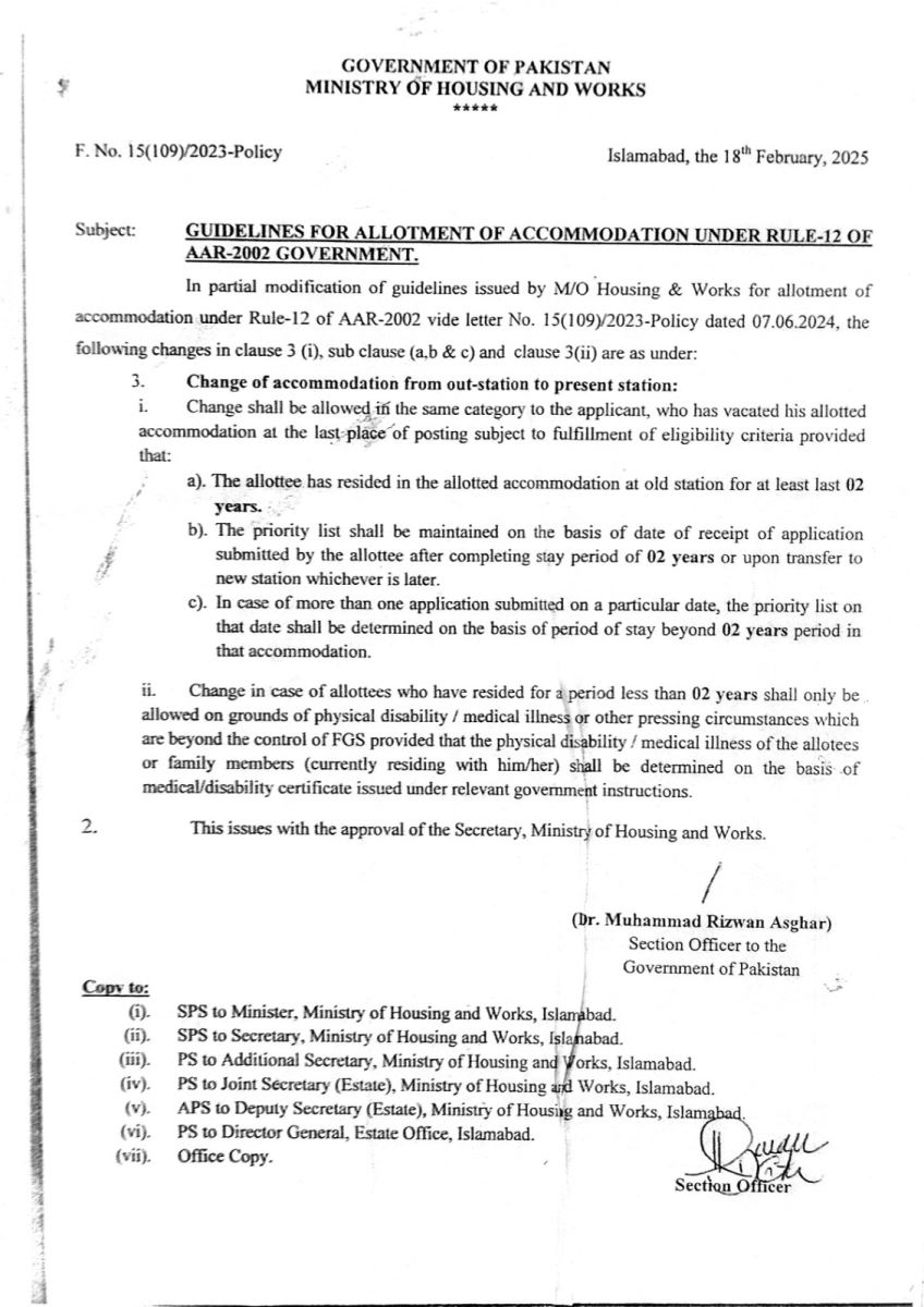- Guidelines For Allotment of Accommodation Under Rule-12 of AAR-2002(out station) dated 18th Feb 2025